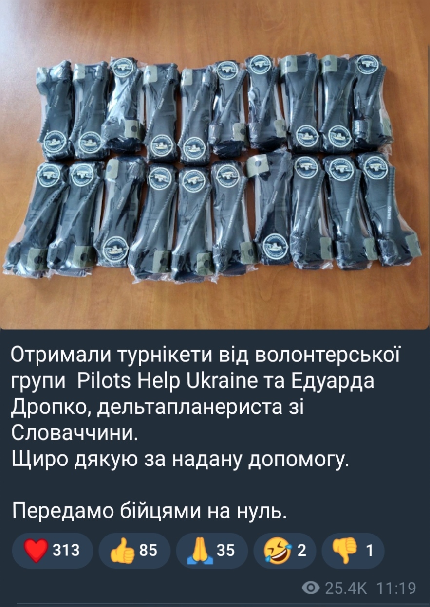 Отримали турнікети від волонтерської групи Pilots Help Ukraine та Едуарда Дропко, дельтапланериста зі Словаччини.